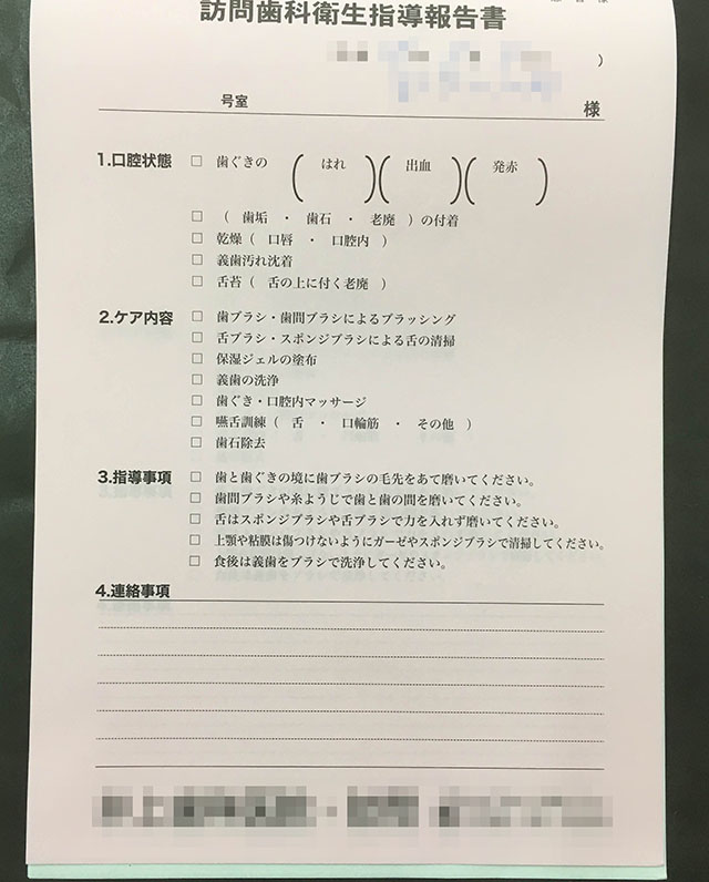 色々な施設を訪問し患者様の状態を把握し、患者様それぞれの歯に対してどの様にケアするかを記録するための報告書です。