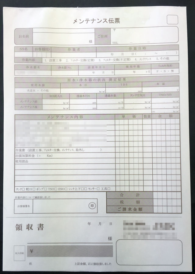 浄水器販売・メンテナンス(メンテナンス伝票)