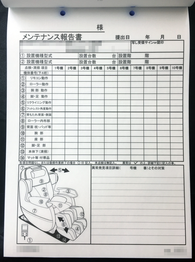 東京都のマッサージチェアレンタルM様から頂いた【メンテナンス報告書】の納品実績です。