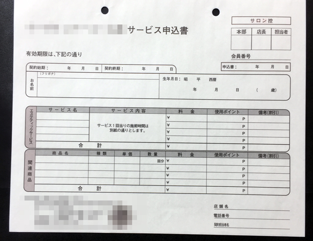 大阪府のエステティック業E様から頂いた【サービス申込書】の納品実績です。