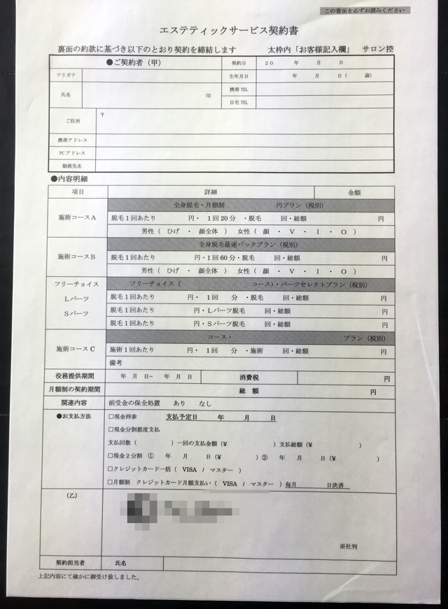 - 東京都のエステティック業O様から頂いた【サービス契約書】の納品実績。