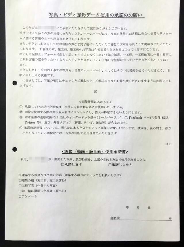 - 岐阜県の塗装業S様より頂いた【承諾書】の納品実績。
