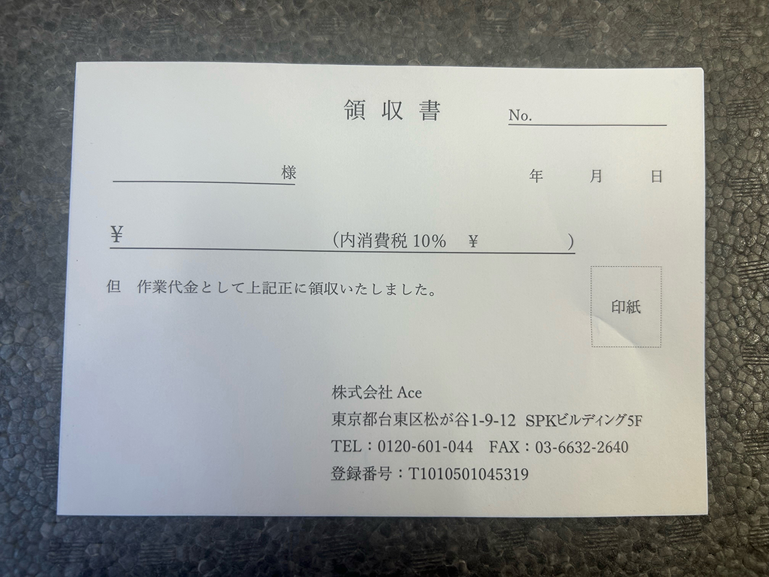 - 東京都の総合住宅サービス事業株式会社Ace様より頂いた【領収書】の納品実績です。