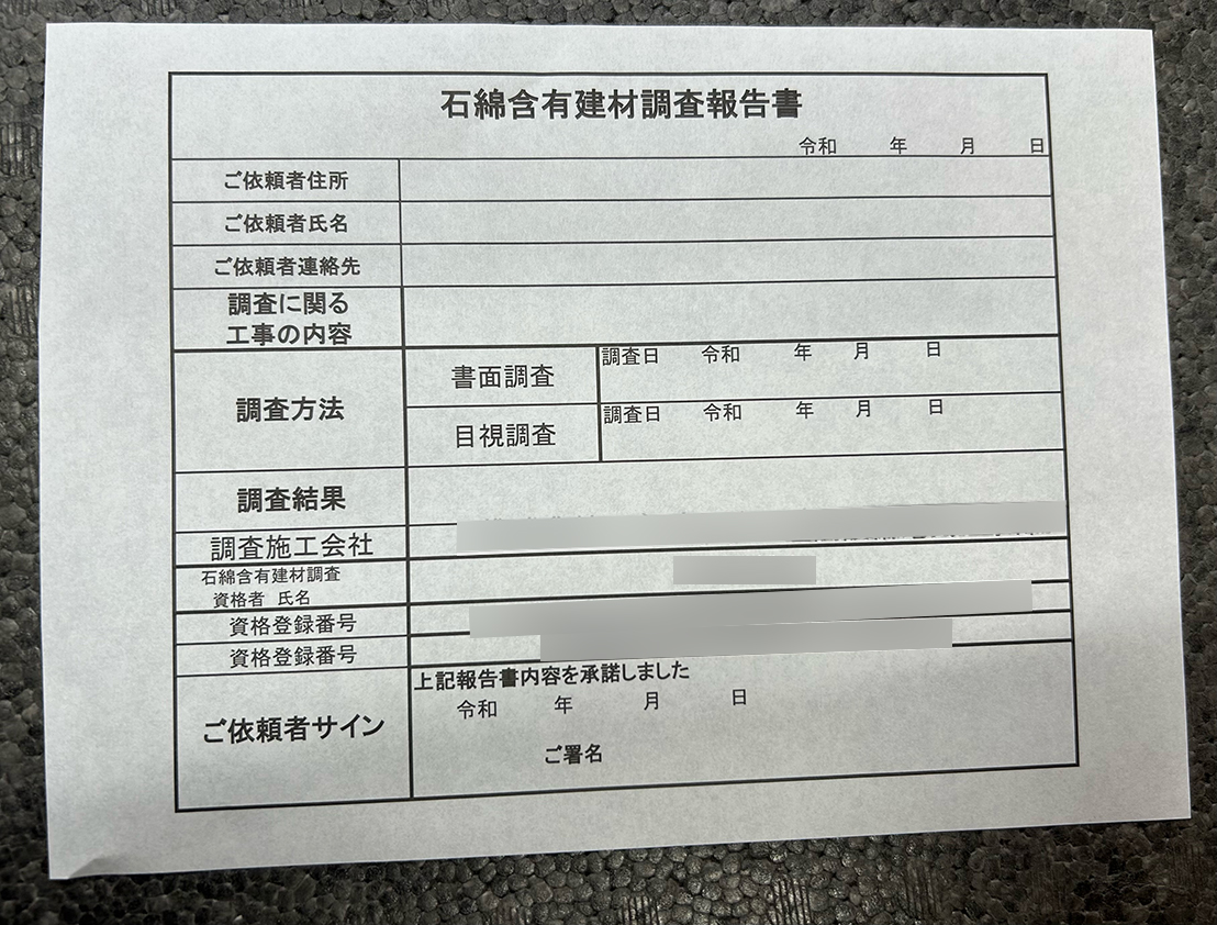 - 静岡県の古物営業B様より頂いた【石綿含有建材調査報告書】の納品実績です。