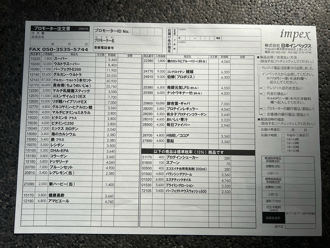 東京都のサプリメントの製造・販売株式会社日本インペックス様より頂いた【注文書】の納品実績です。